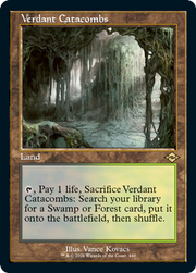 {T}, Pay 1 life, Sacrifice Verdant Catacombs: Search your library for a Swamp or Forest card, put it onto the battlefield, then shuffle.